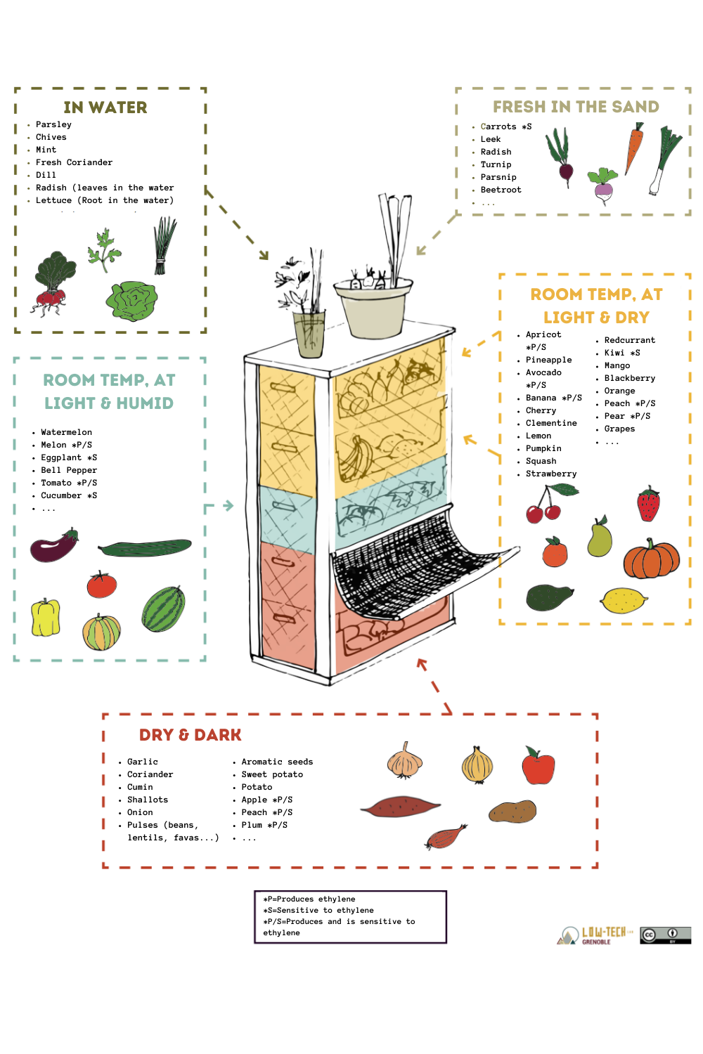 They categorize various fruits, vegetables and herbs depending on the type of storage they last longer in whether it needs light, cold, humidity or can be stored at room temperature, it is all there.