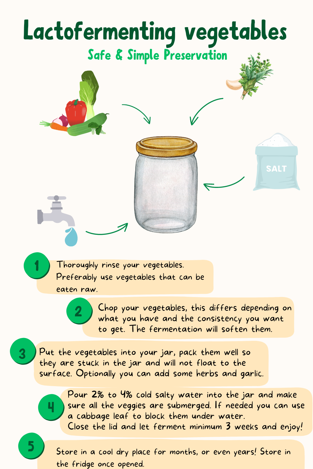 Fermentation is a very energy efficient preservation method, that is also one of the safest. Just like pickling it relies on creating an acidic environment in which a wide range of bacteria and yeasts compete, making it extremely hard for pathogens to develop and take over. The only difference here is that we do not use any vinegar. Instead, we rely on the lactic acid produced by the fermentation of the vegetables in salty water.